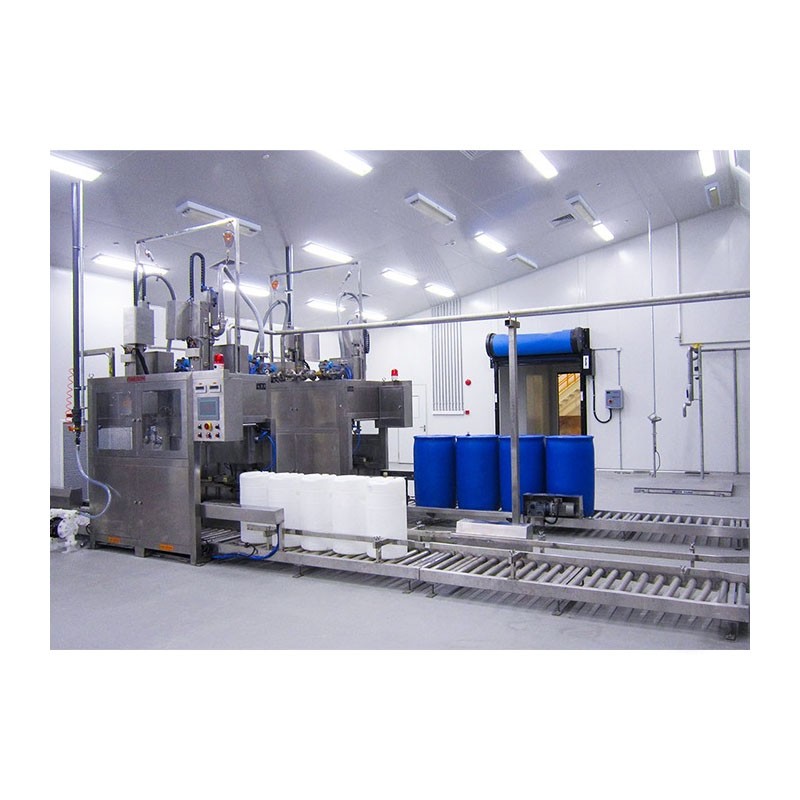 開機---人工放桶至秤臺快速定位對口--系統自動偵測桶位、灌槍自動插入桶口---自動去皮---自動打開灌槍及球閥組開始灌裝---大、中、小、微量四段式灌裝---到達目標值--灌槍自動關閉并升至 桶外---人工移桶至夾蓋區---自動氣動夾蓋---自動推桶至暫存區---人工碼垛。