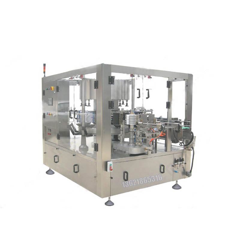 人工把空瓶和蓋子倒在理瓶盤理蓋盤,瓶子自動理出,瓶子依次進入轉(zhuǎn)盤,依次進入灌裝、旋蓋工位,旋蓋完成后成品輸出后進入提升機,提升機把瓶子提升到振動盤,振動盤自動理料,自動貼標,全程PLC控制,只需要一人補料巡機。