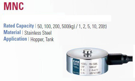 CAS load cell, MNC miniature cake load cell models: MNC-50L, MNC-100L, MNC-200L, MNC-500L, MNC-1, MNC-2, MNC-5, MNC-10, MNC-20.