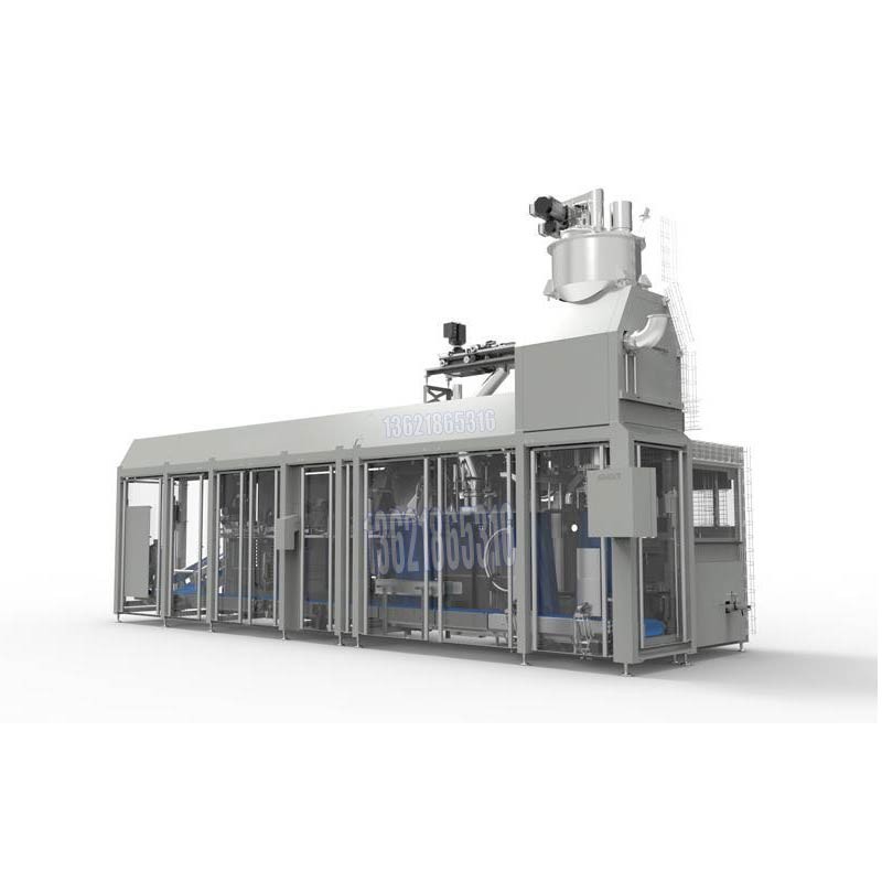 人工掛袋,自動夾袋機構夾袋 → 螺旋自動供料、自動稱量 → 稱重完成,自動放袋 → 軌道車將稱好的產品自動輸送 → 叉車將產品叉走;