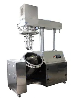 This machineconsists of:oiltank, water tank, vacuum homogeneous emulsifying machine, heating system, mixing system, vacuum system,hydrauliclifting system, operation control cabinet, piping system. It