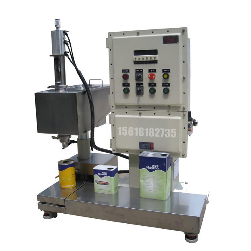 當儲槽里原料低于下限位時,供料裝置自動打開給儲槽供料,當儲槽液位達到上限位時,關閉供料裝置。人工將空桶放到秤臺上,人工對孔,然后點擊啟動按鈕,儀表首先判桶并扣除空桶皮重,灌裝頭打開進入快速落料,當達到慢進料設定重量時,自動轉為慢速落料。當重量達到目標值時停止落料,此時儀表回皮顯示總重,人工將成品桶推到成品暫存區,人工索蓋然后取下桶,整個動作流程結束。