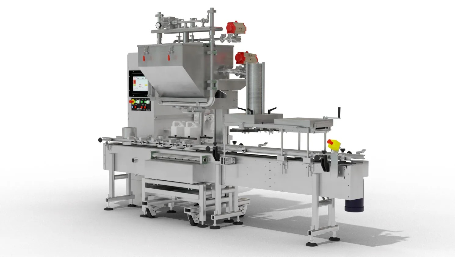 雙頭在線自動(dòng)凈重灌裝封口機(jī),適用于1/2品脫至加侖的容器,配有DFS灌裝車