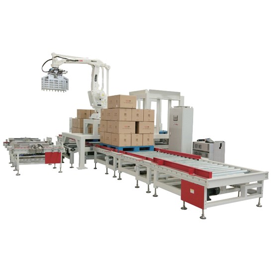 機器人碼垛機適應于潤滑油、食用油、涂料、日化、食品等生產企業對紙箱、袋裝、罐裝、盒裝、瓶裝等各種形狀的成品進行碼垛。結構非常簡單,容易保養及維修;主要構成零件少、配件少,所以維護費用很低;機械手碼垛機可以設置在狹窄的空間,即可有效的使用,全部控制可在控制柜屏幕上操作即可,操作非常簡單??扇旌蜃鳂I,配備機械手可替代不少工人的工作量,由此每年能節省幾十萬的人力資源成本,達到減員增效。變換抓手可實現多種產品的混線生產。機器人有效負載50-450kg;適用范圍:瓦楞紙箱、塑膠箱、桶狀包裝物、袋狀包裝物。