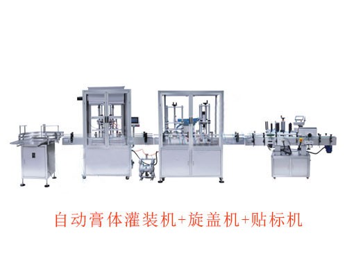 自動膏體灌裝機+旋蓋機+貼標機產品介紹:全自動灌裝生產線適用各種膏體、液體產品,該全自動滴灌蓋、精油灌裝旋蓋生產線有理甁機、泵頭蓋、滴灌蓋灌裝旋蓋機機、全自動圓瓶貼標機、收瓶機組成。可自動完成滴灌蓋類產品的自動灌裝旋蓋貼標等工作,結構合理考究、運行穩定。泵頭蓋、滴管蓋小瓶灌裝旋蓋機特點:1、觸摸屏顯示,PLC控制系統,無瓶不灌裝2、易清洗。3、蠕動泵或活塞泵灌裝,計量準確,操控方便。4、運行穩定,
