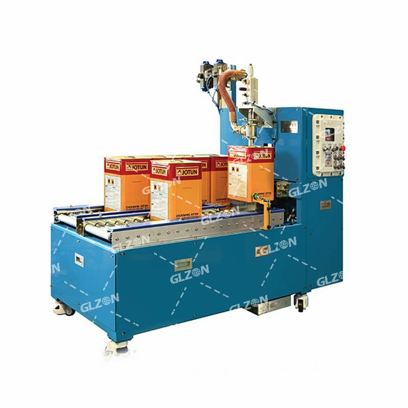 操作流程:操作時,操作者僅需簡單設(shè)定好灌裝重量,按下[啟動]按鈕,再將擺放到空桶輸送機上。灌裝機就會自動將空桶輸送到位并推入磅臺,然后自動將灌裝頭插入桶內(nèi),并將空桶自動去皮后打開灌裝閥門,精確地雙速灌裝;灌裝結(jié)束,灌裝頭自動提升至桶外,輸送機自動將灌裝完成的包裝桶送出,人工旋蓋并擺放到托盤即告完成。